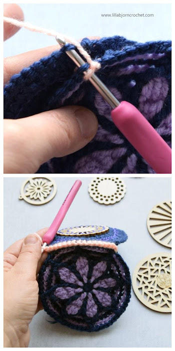 If after this round bottom is the same size as top with flower, please, fasten off. If bottom is smaller (or doesnt fit wooden ornament in size), please, make one more round with sc (insert the hook through both loops), and then fasten off.