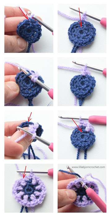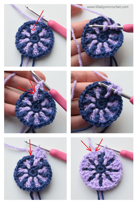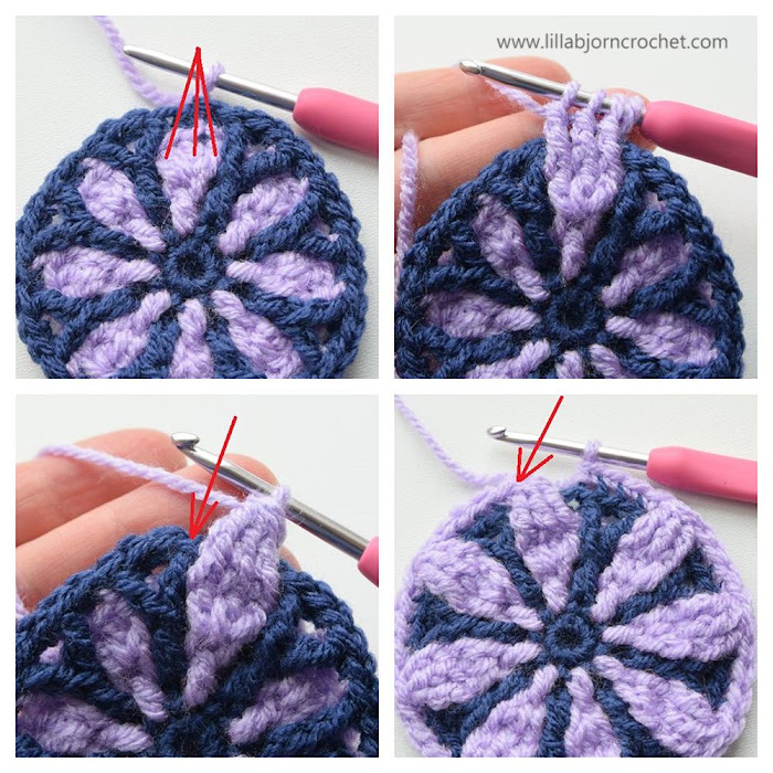 Every round of the top flower is made with just one color. The yarns are not cut after every round but are carried up to next rounds on the wrong side. The colors are changed in the joining slip stitch (unless otherwise stated in the pattern).