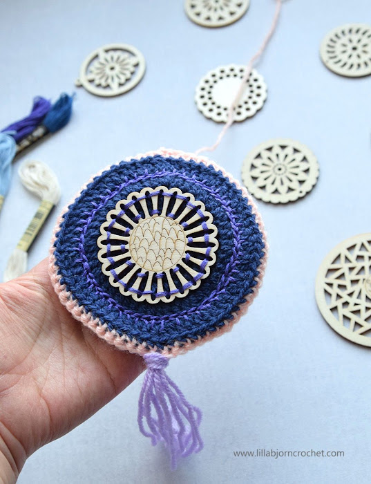Hello and welcome to the very last bit of Rozeta CAL. I hope you had a very good rest during holidays with lots of time to finish your Rozeta. Most likely you have yarn in some colors left. And you were probably guessing why there was wooden ornament and embroidery thread included into the Rozeta kits. So today I will answer your questions! We will be using leftovers and wooden ornament to create a small hanging decoration a micro Rozeta, as I called this pattern.
